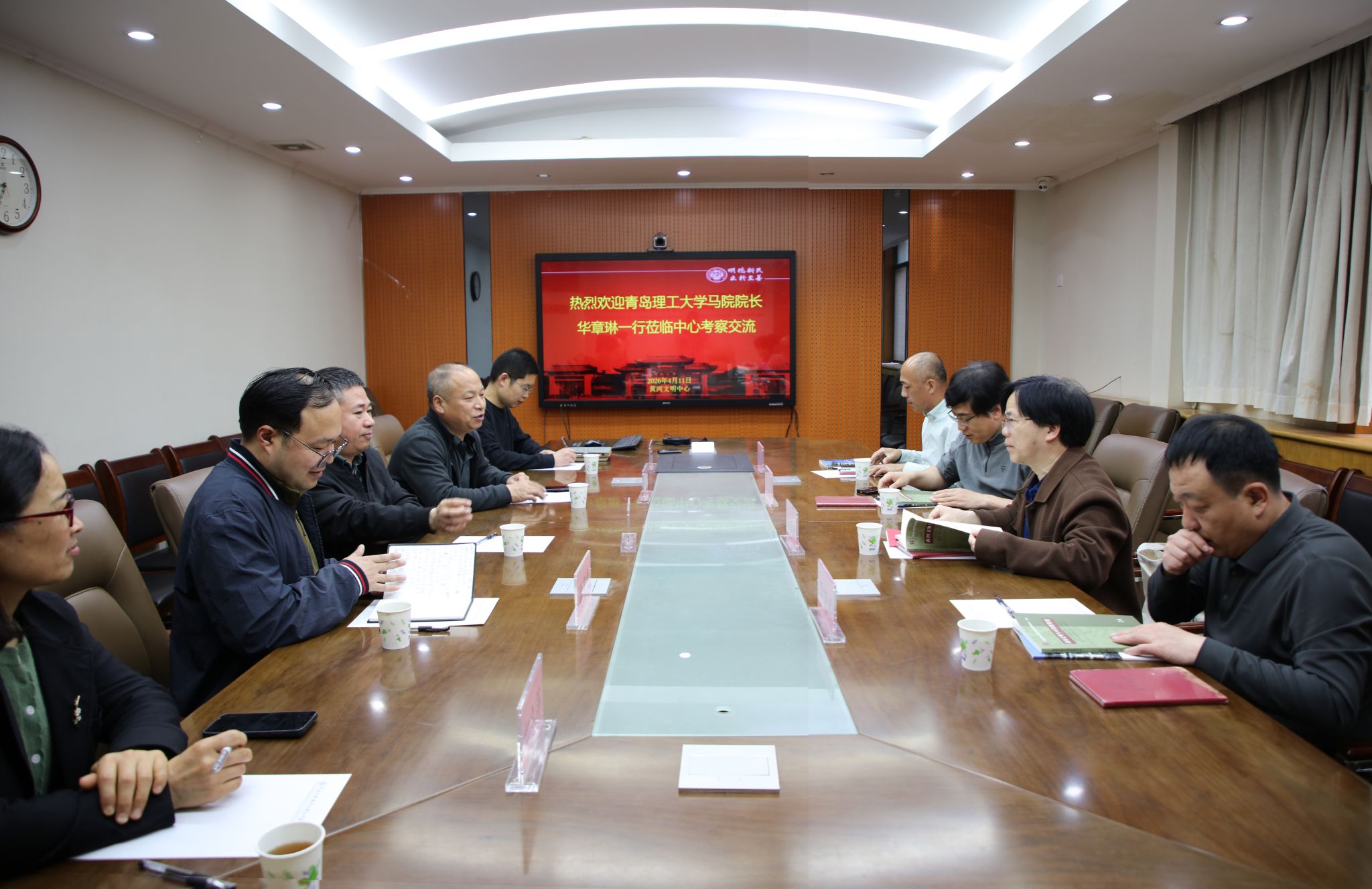 4月11日,青岛理工大学马克思主义学院党委副书记、院长华章琳一行4人,莅临河南大学黄河文明与可持续发展研究中心(以下简称“中心”)开展考察交流。座谈会在明伦校区新行政楼316会议室召开。中心党委副书记、副主任万合利,中心副主任陈家涛、侯卫东,以及李茂林、郜冬萍副教授出席会议。双方就黄河文明传承与创新、黄河文明促进地方经济高质量发展、黄河文明与学科发展等内容进行深入交流,会议由中心副主任陈家涛主持。