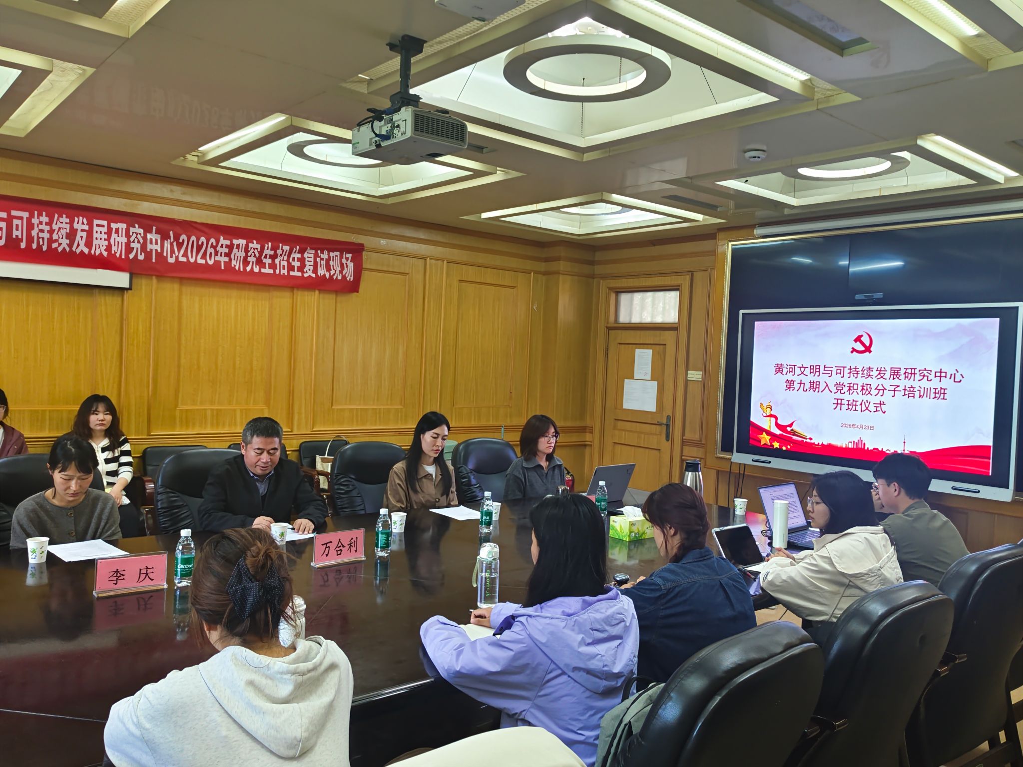 2026年4月23日,中心举行第九期入党积极分子培训班开班仪式。仪式由中心党委办公室主任王晏主持,中心党委副书记万合利、入党积极分子培训班班主任李庆、培训班全体学员出席。开班仪式在庄严肃穆的中华人民共和国国歌中拉开序幕,接着,李庆宣读了《黄河文明与可持续发展研究中心第九期入党积极分子培训班学员纪律管理规定》,明确了积极分子培训期间的纪律及要求。随后,万合利为本次培训班开班作动员讲话。他指出,入党积极分子集中培训是追求思想进步的重要一课,也是入党路上的重要环节。他希望全体学员严守培训纪律、互帮共进,认真学好理论知识,切实把学习收获落到实处,在日常学习工作中严于律己、以身作则,自觉以实际行动向党组织靠拢。
