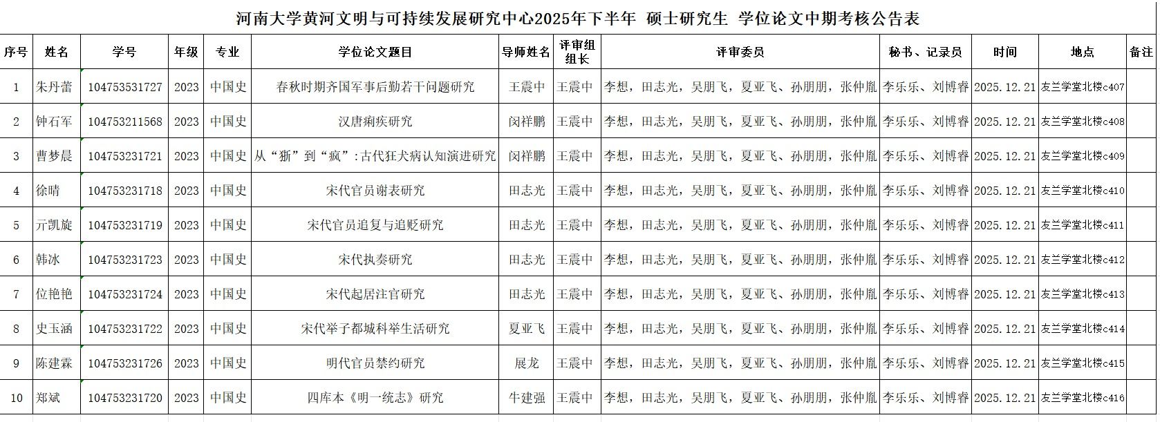 河南大学黄河文明与可持续发展研究中心2025年下半年硕士研究生学位论文中期考核公告表